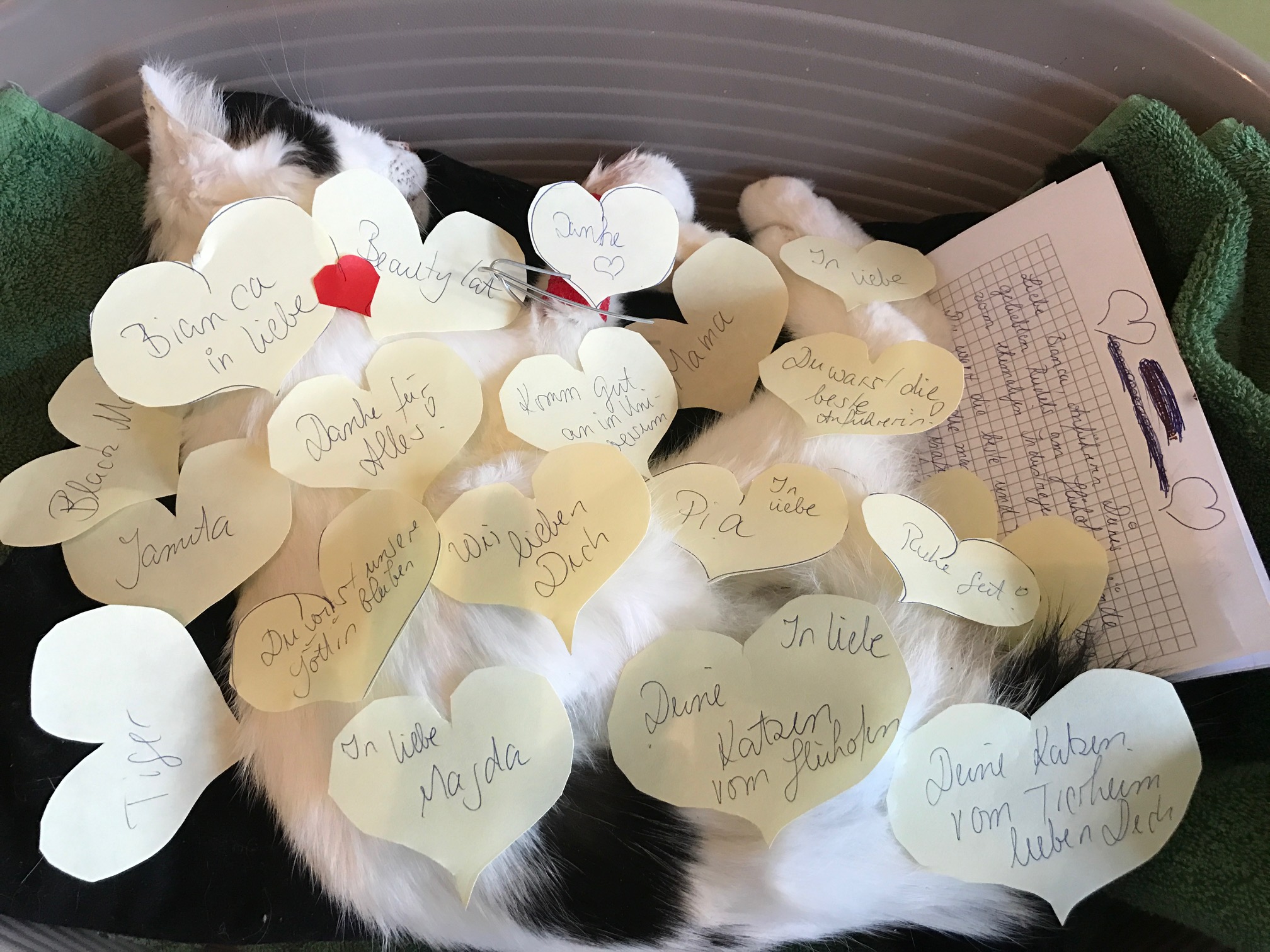 Ich wünsche Dir, liebe Bianca, viel Frieden in deiner neuen Welt, und dass du im Himmel und von oben dein Rudel nun als Göttin begleiten darfst. Bestimmt tust du das und wachst weiterhin über Beauty Kater, Rico, Black Mama, Leo, Tiger, Prinzessin, Blindy und noch ca. 30 weitere Katzen, die alle aus deinem Rudel stammten und zwischenzeitlich gut vermittelt wurden oder noch im Tierheim oder bei mir sind. Magda und ich werden nach ihnen schauen und versuchen es so gut zu meistern wie du das tat. Liebe Bianca, beste Katzenanführerin der Welt, ruhe in Frieden – wir haben dich sehr geliebt. Deine Katzen mit Pia und Magda