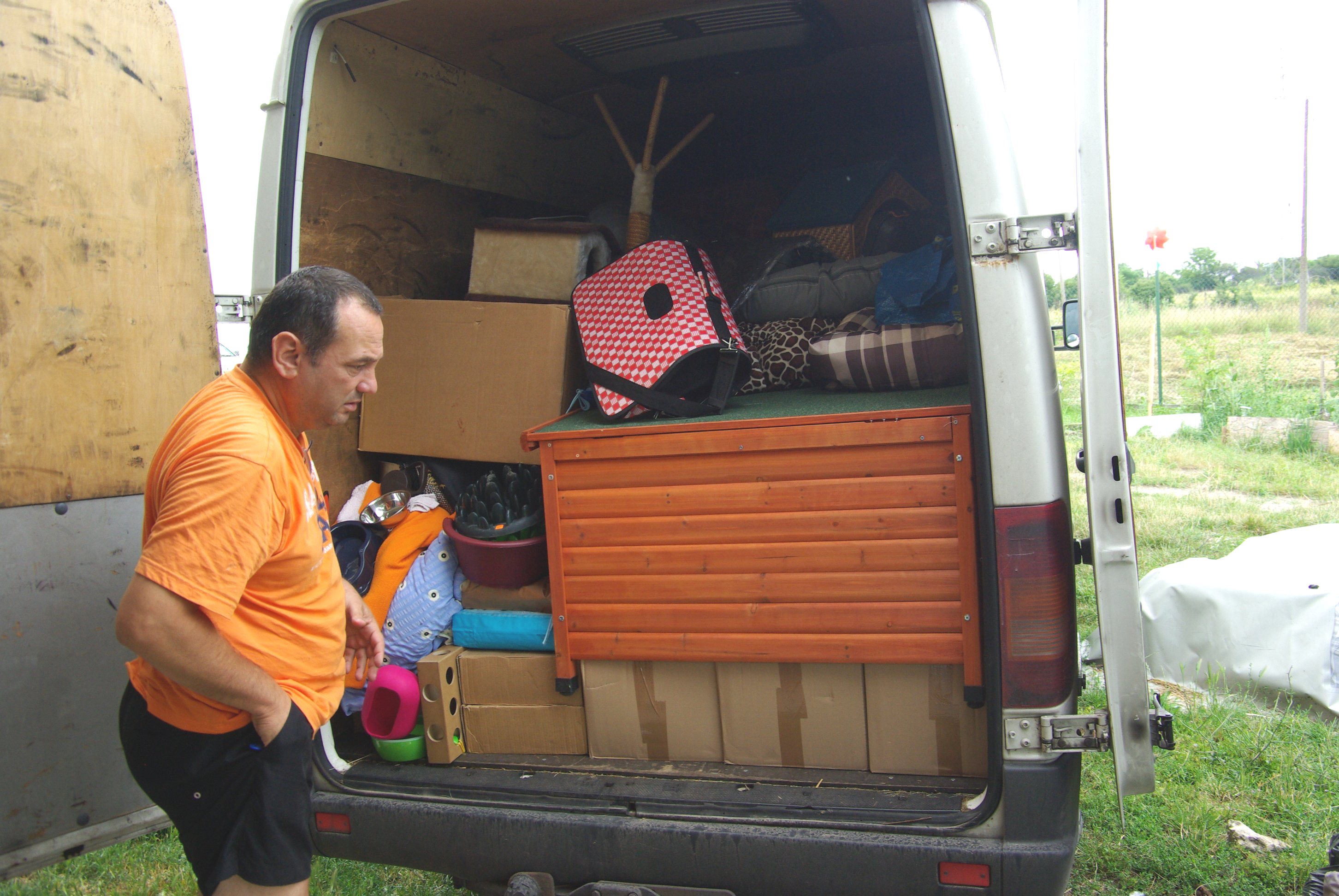 Der Transporter ist schon fast ausgeladen und endlich kommt Dobrins Häuschchen dran. So lange hat er nun auf sein Häuschen gewartet und ist meeggaa glücklich! Auch der Schneckenzaun wurde sehnlichst erwartet. Die Gurkensetzlinge konnten bis jetzt nicht überleben. Die Decken und Schlafplätzli werden die kalten Winternächte etwas gemütlicher machen und das Futter die immer hungrigen Bäuche füllen. Die