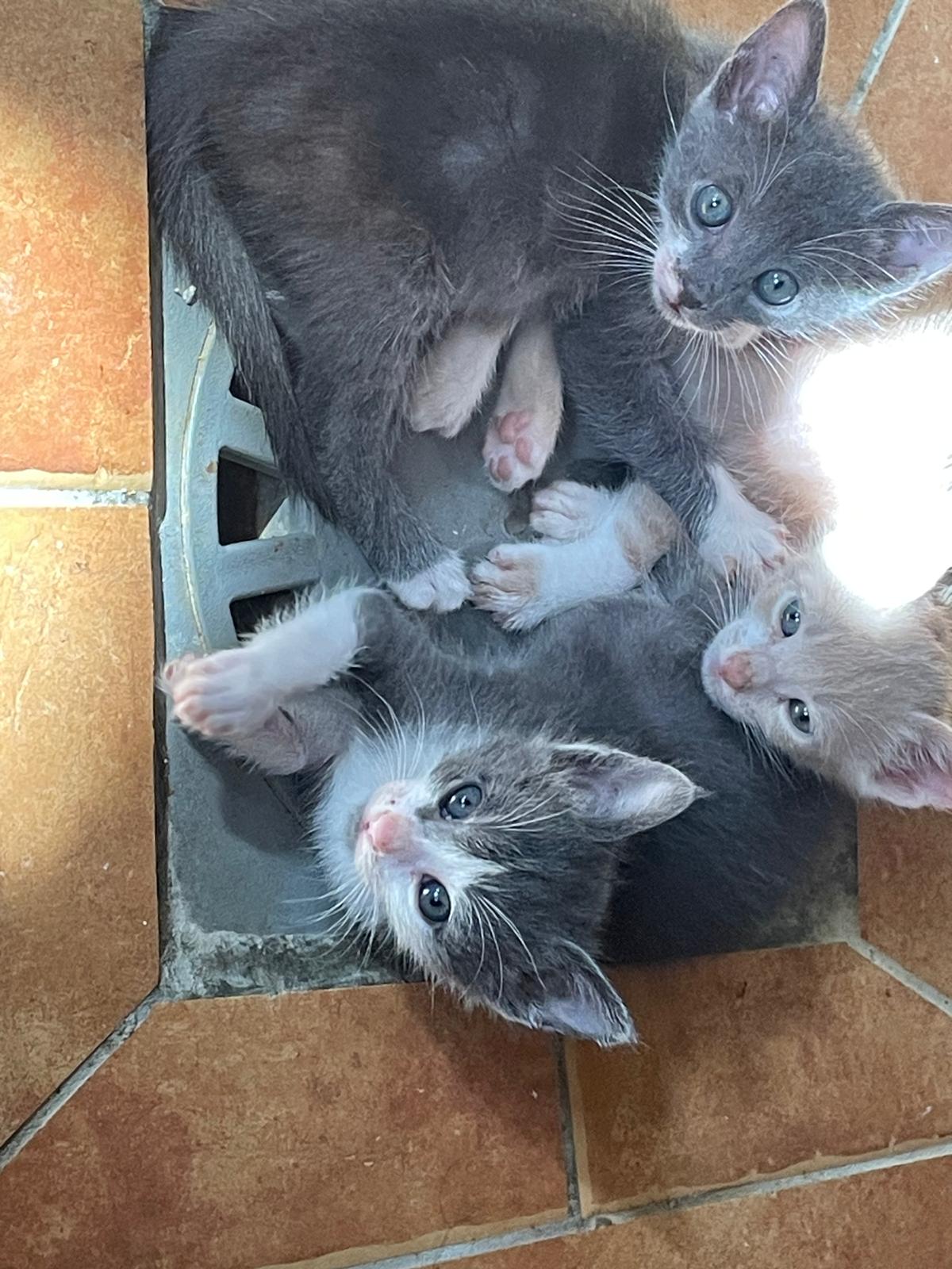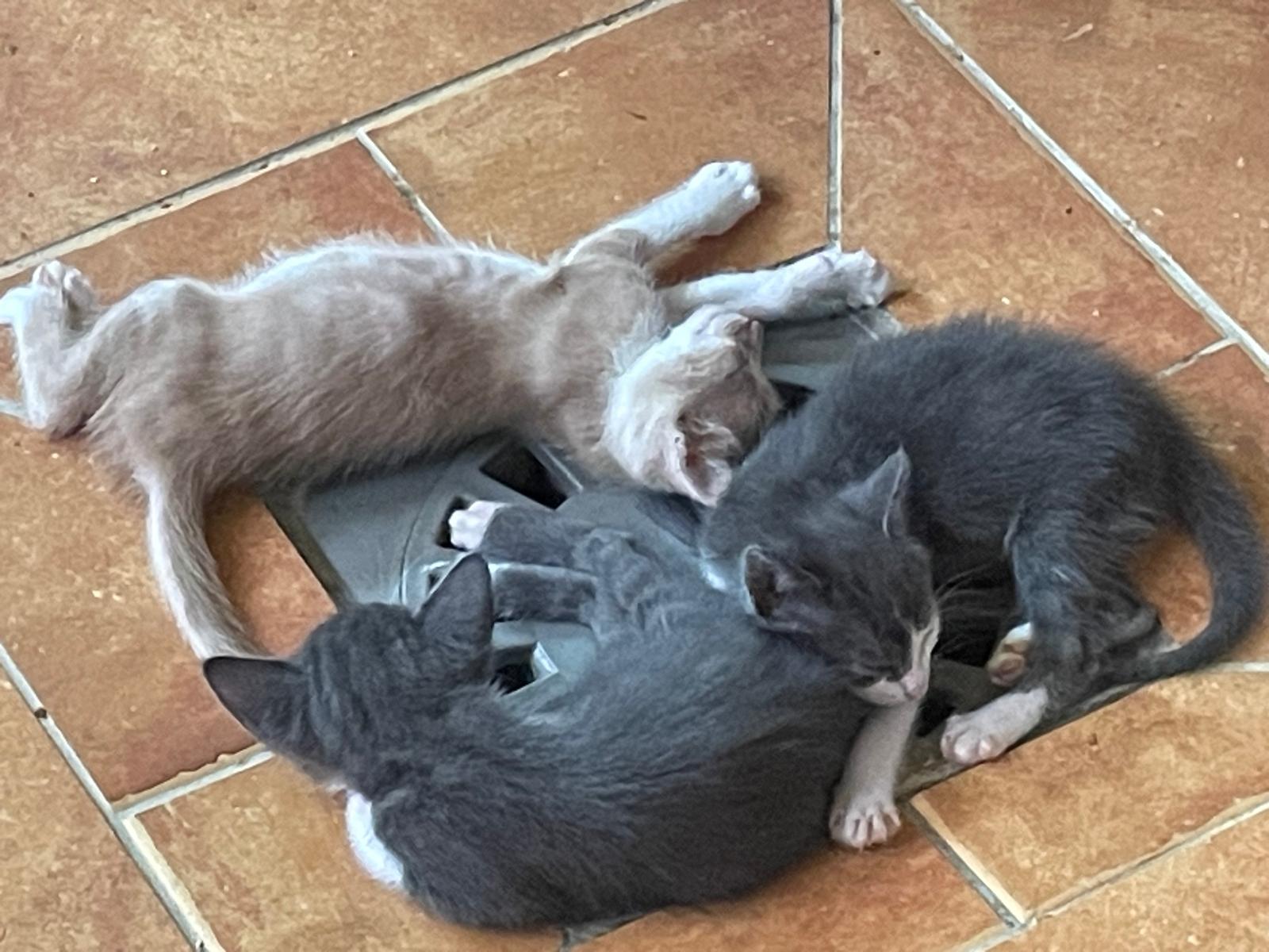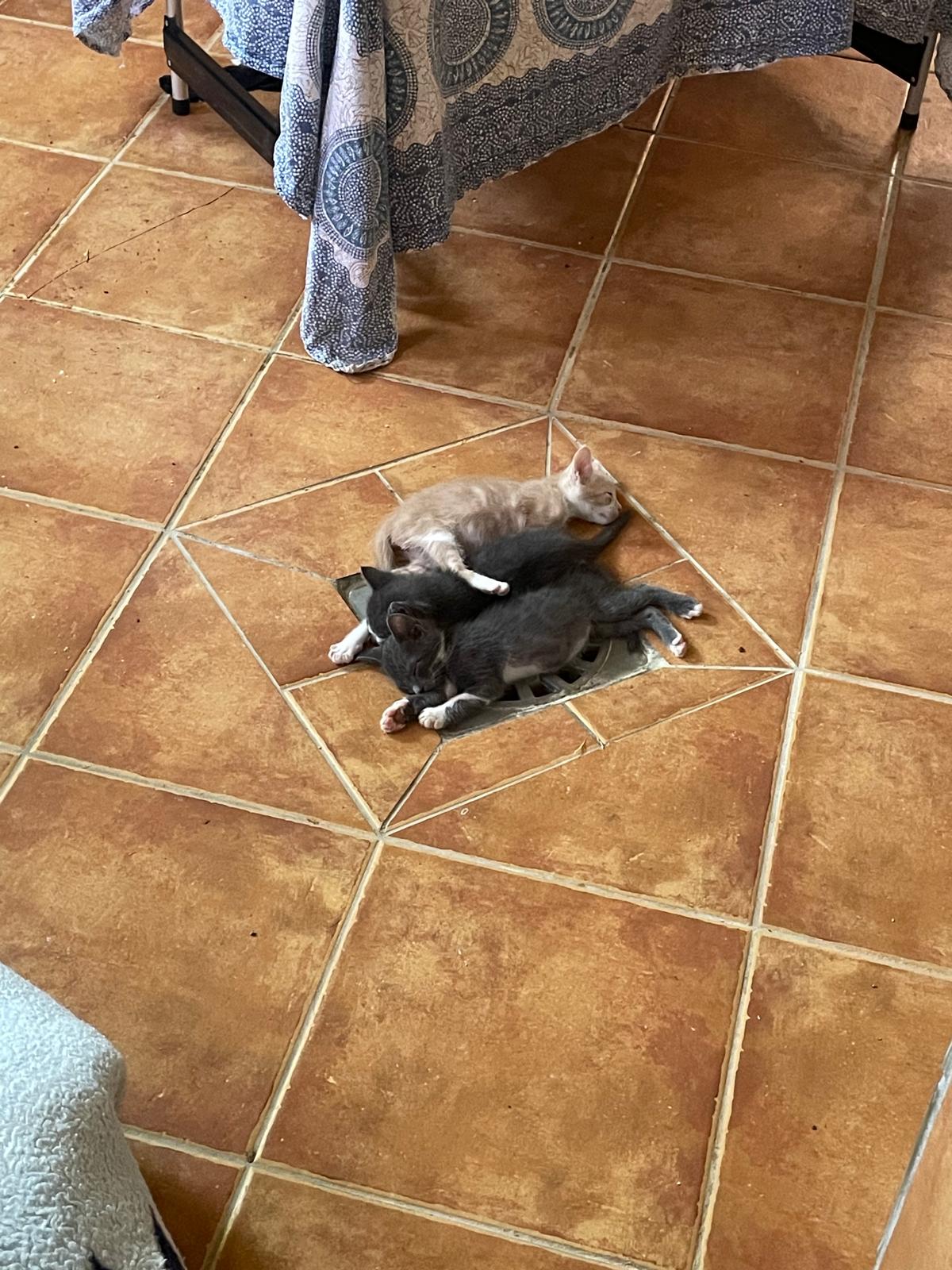 Es ist furchtbar heiss in Spanien und die kleinen Kätzchen wissen sich zu organisieren. Ihr Lieblingsplätzchen ist direkt über dem Bodenablauf, wo immer etwas kühle Luft heraufkommt……