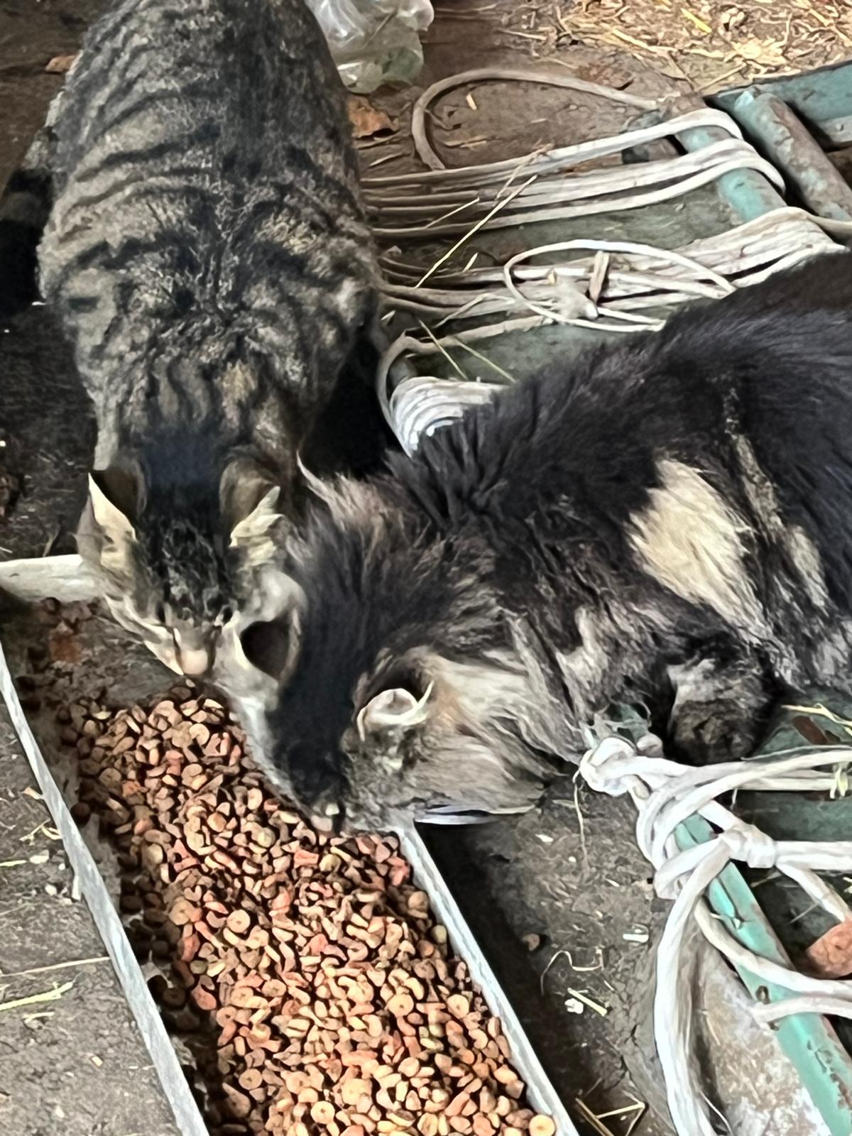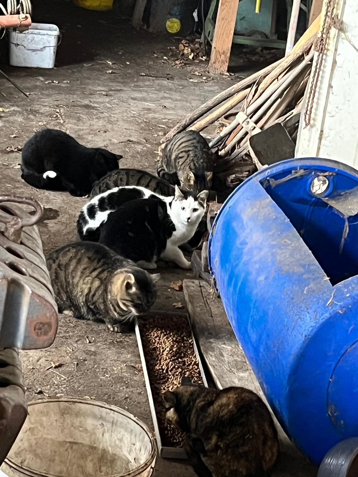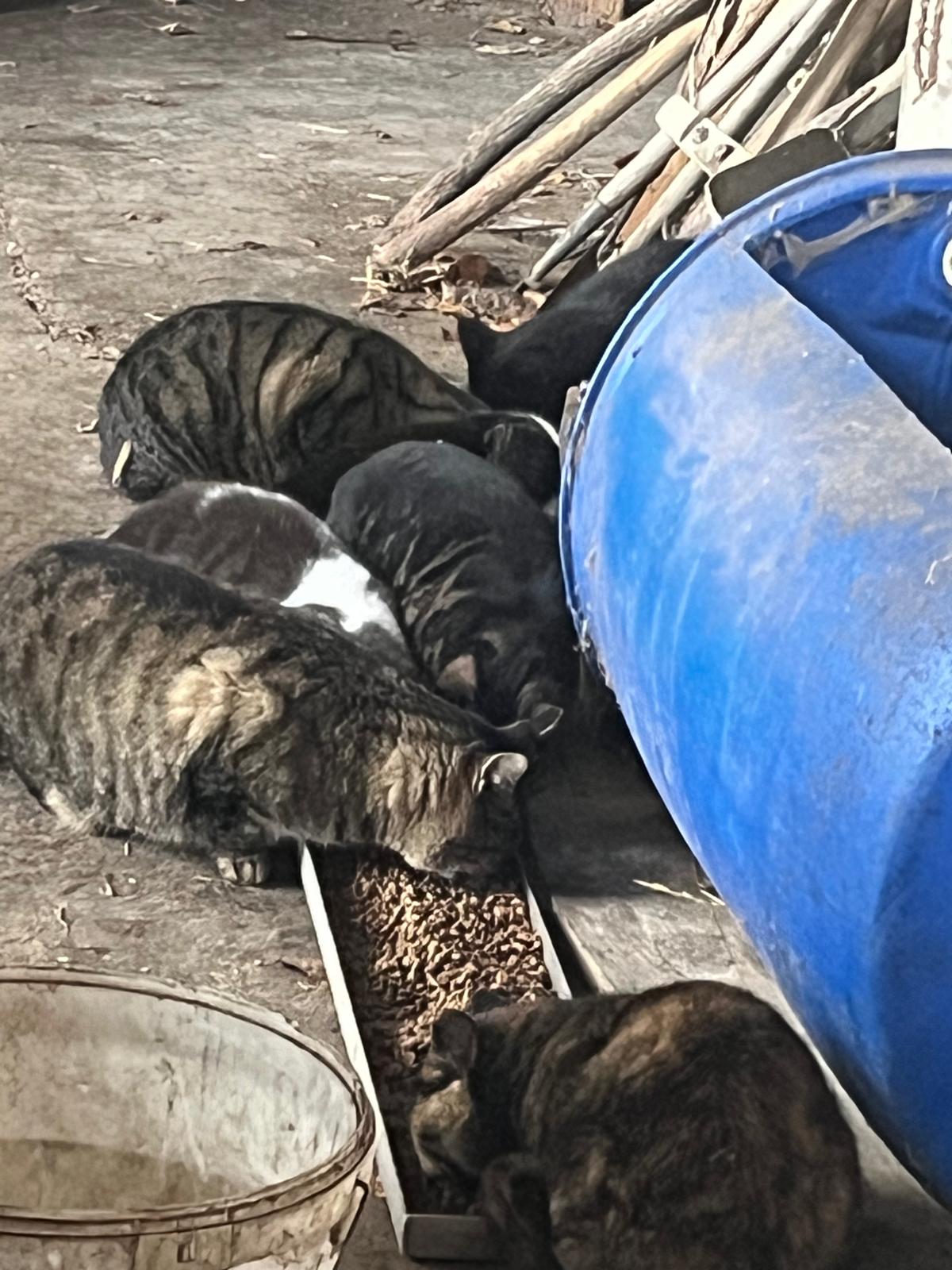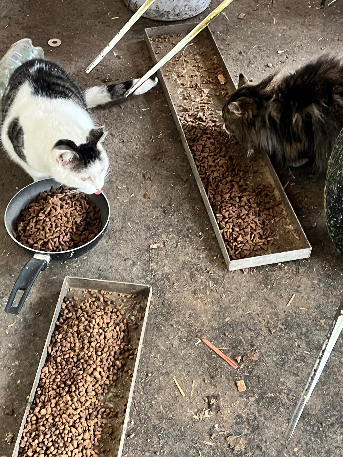 Susan, Barbara, Ulli und Yvonne verbringen viel Zeit mit den Bauernhofkatzen. Sie helfen sie einfangen, betreuen sie nach der Kastration und wo nötig auch bis sie wieder gesund sind. Sie ziehen die Kleinen auf, bis sie vermittelt werden können und die kastrierte Mamikatze wieder zurück auf den Bauernhof darf. Gerade bei verwilderten Mamis ist das die beste Lösung, wenn der Bauer Hand dazu bietet. Oft werden die Büsis dort jedoch nicht gefüttert, sie sollen sich selber versorgen. Manchmal ist der Bauer jedoch bereit, die Helferinnen wieder zum Füttern auf den Hof zu lassen. Natürlich fehlt es an Futter und da bin ich gerne bereit, von meinem Futter abzugeben, was immer sehr gerne angenommen wird. Danke an alle, die mir ihr überzähliges Futter anvertrauen, das kommt dann auch anderen Tierschutztieren zugute, wenn ich übrig habe!