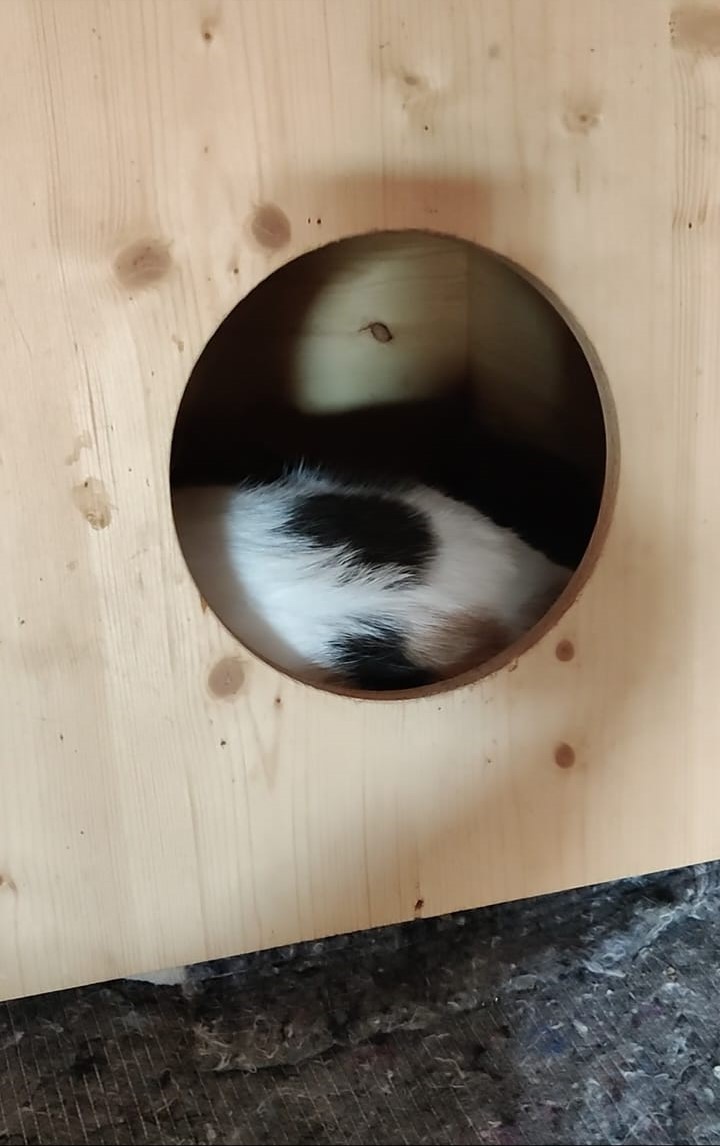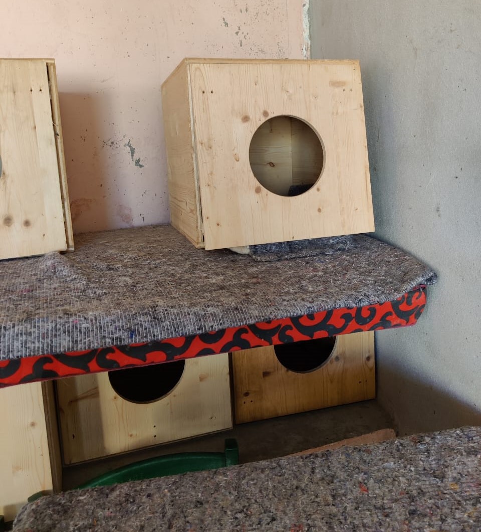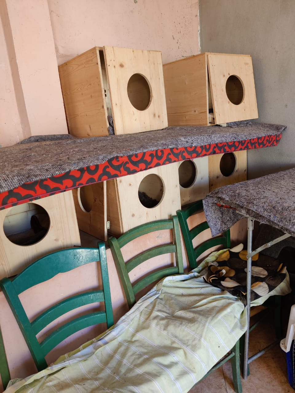 In Marokko ist Holz sehr teuer, daher sind Katzenhäuschen – wenn überhaupt vorhanden – immer aus Plastik. Plastik wird in der Hitze heiss und in der Kälte kalt. Daher haben wir ihr immer wieder kleine Hunde- bzw. Katzenhäuschen aus Holz mit auf den Transport mitgegeben und einmal konnten wir verschiedene Holzboxen günstig übers Internet bestellen. Unsere Lisa hat diese dann katzentauglich bearbeitet – d.h. Löcher geschnitten und bei den Deckeln Scharniere montiert. Inzwischen sind einige in Agadir angekommen und werden rege benützt! Danke Lisa!