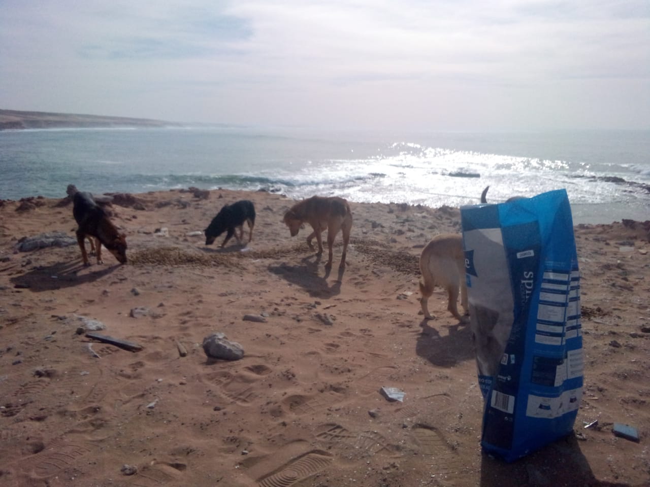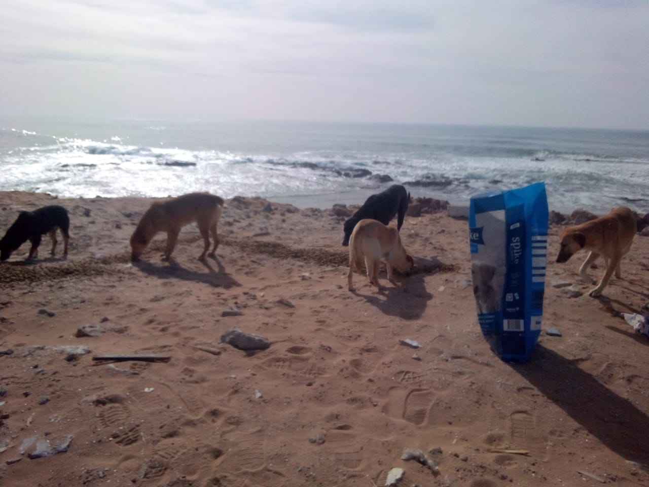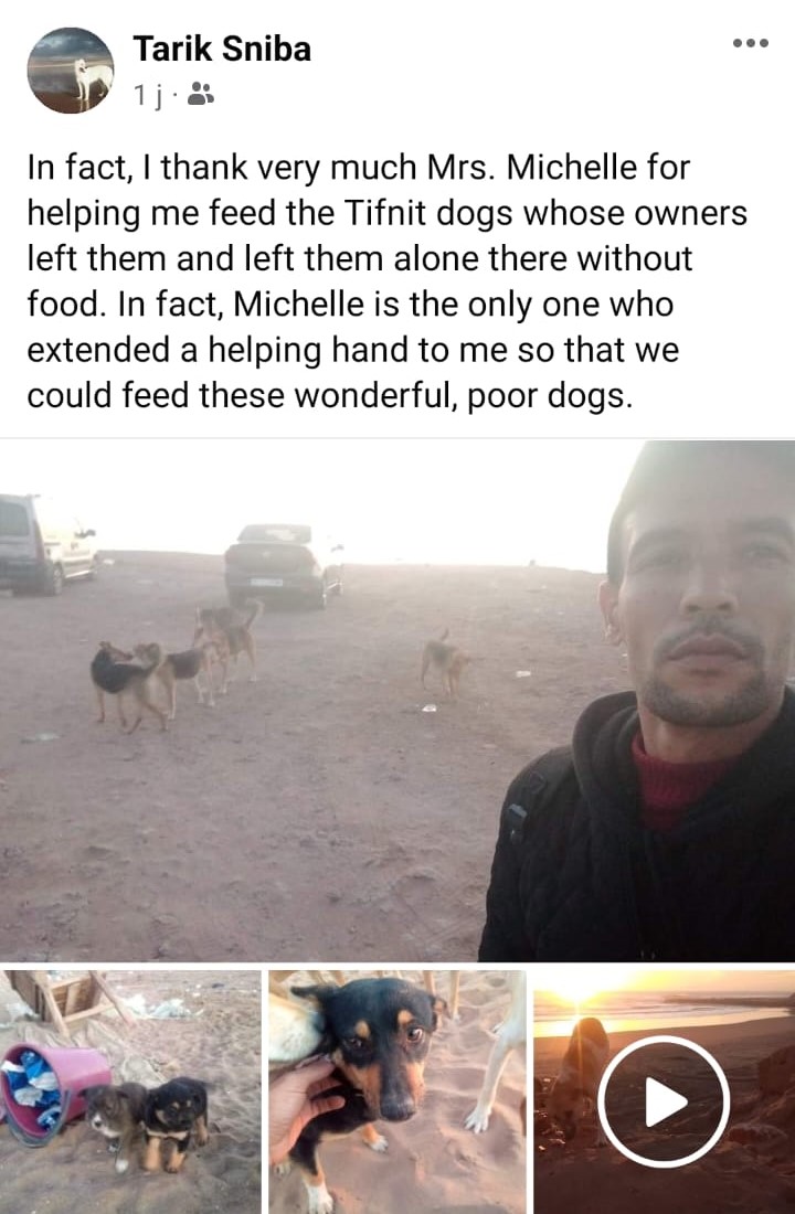 Ein Chauffeur bringt Futter zu Tarik Sniba, der mit dem Chauffeur an den Strand des früheren Tifnit fährt und den Hunden Croquetten und Wasser bringt. Heute wurde eine alte Hündin zu Michèle mitgenommen. Diese Hündin hatte viele Jahre bei einem Amerikaner gelebt, der nun ohne sie weggezogen ist. Sie lebte im Haus und wurde betreut und war nun völlig orientierungslos ohne ihr Zuhause! Diese Hündin sucht noch eine Patin!