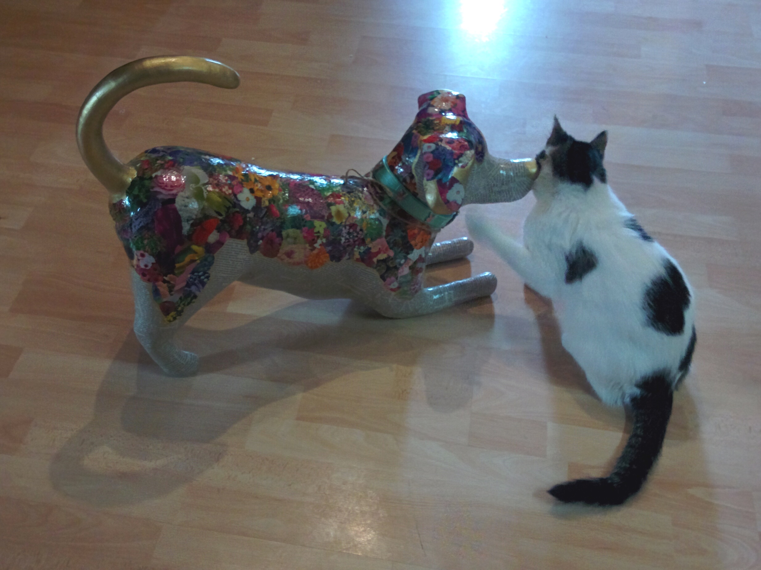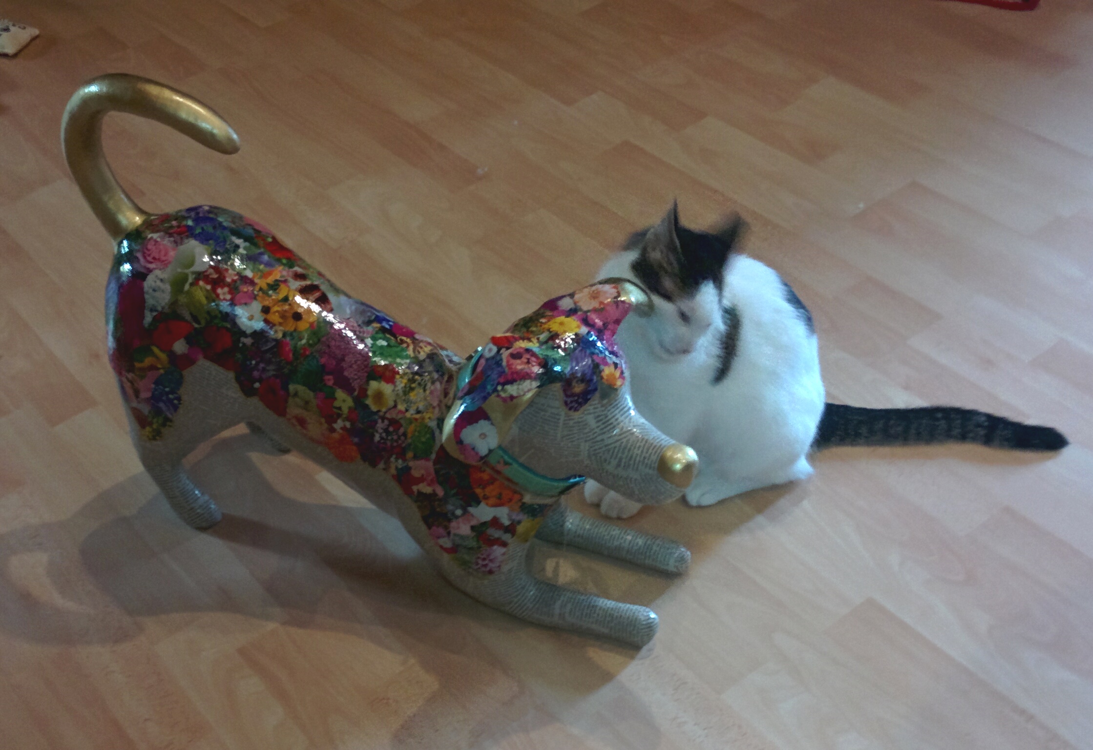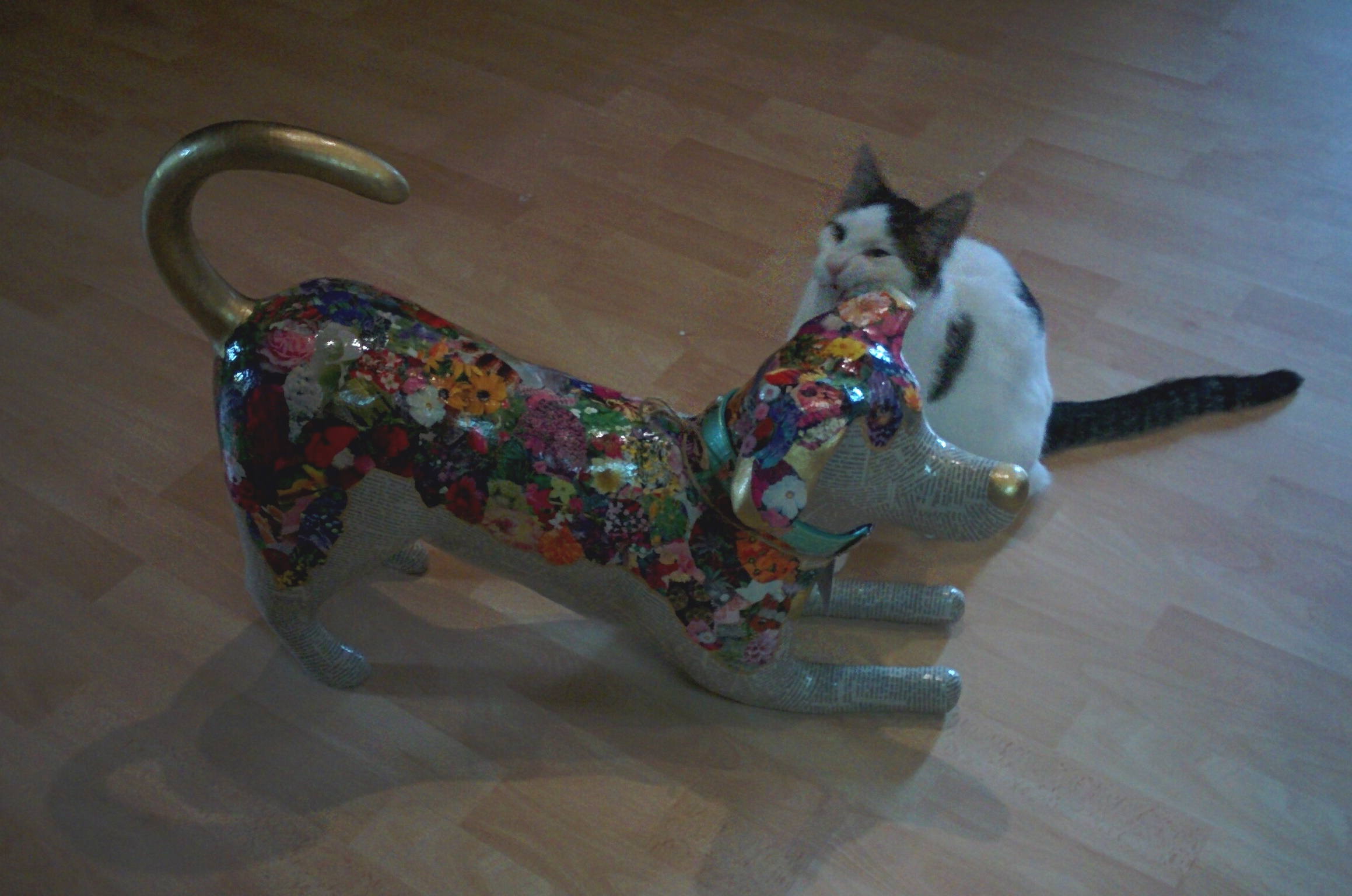 Kathrin Villiger, von PappArtTiere, hat mich mit einem einmaligen Papphund überrascht! Wer hilft mir, einen Namen für ihn zu suchen?
