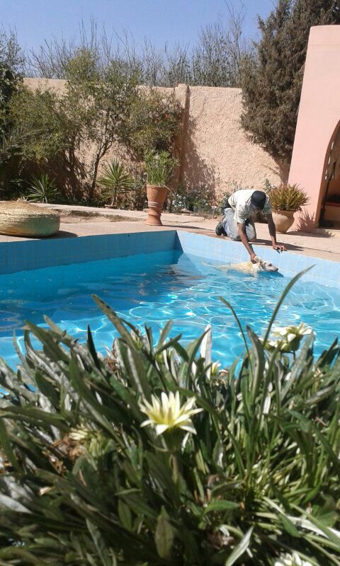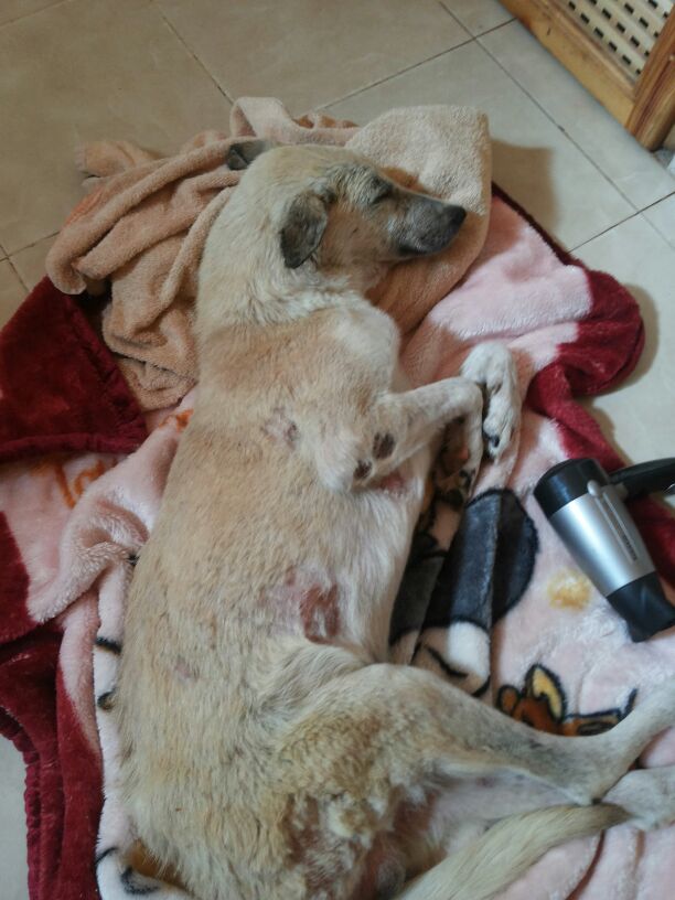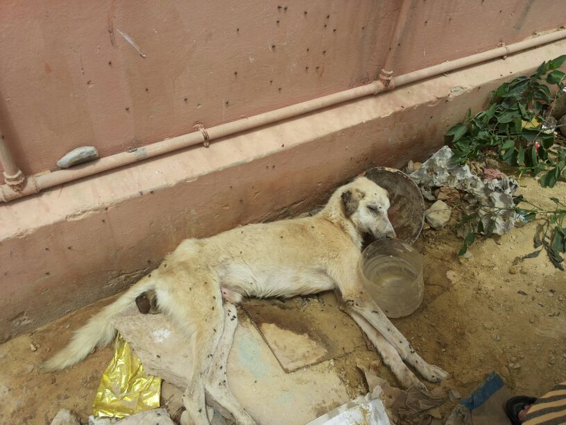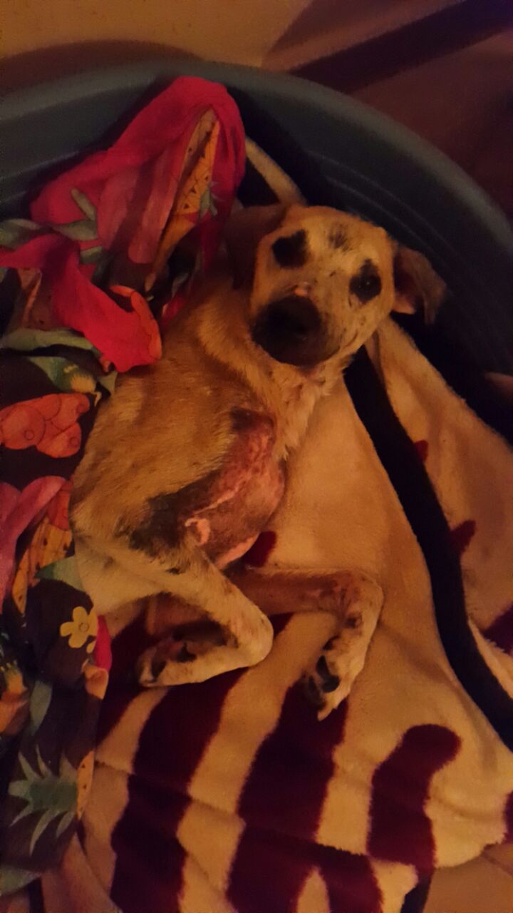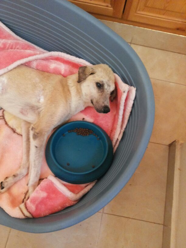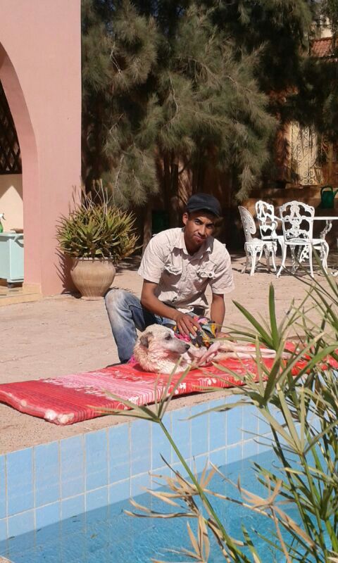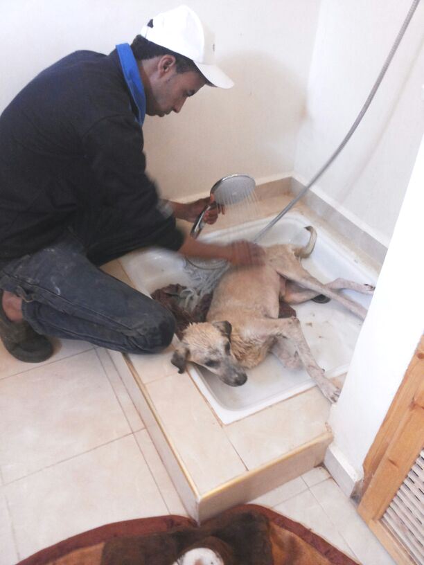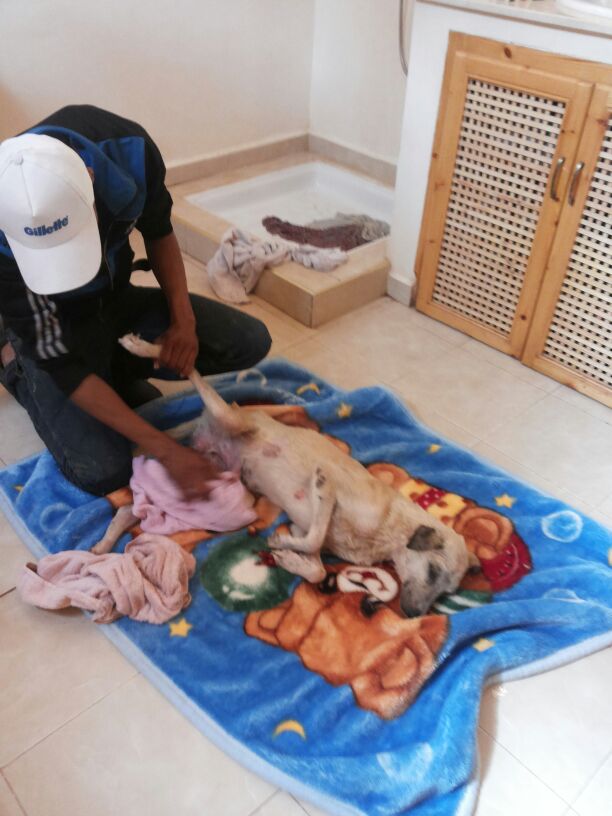 Anlässlich eines Kastrationseinsatzes am Strand von Taghazout fiel Michèle eine Mauer auf, an der viele Fliegen sassen. Das schien ihr verdächtig und sie ging hin und zu ihrem Entsetzen sah sie darunter einen sterbenden Hund im Schmutz liegen. Er lebte zwar noch, konnte sich aber nicht Bewegen und bei näherer Untersuchung erkannte sie, dass er einen Unfall gehabt haben muss, denn er hatte verschiedene Verletzungen, aus denen bereits Maden krochen. Sie gab ihm Wasser und lud ihn ins Auto und brachte ihn auf die Ferme. Dort wurde er gefüttert, gewaschen, geduscht und getrocknet, die Wunden versorgt und in ein weiches Bettchen gelegt. Er war sehr schwach und Michèle glaubte nicht daran, dass er überleben würde. Er sollte jedoch nicht einsam, durstig und hungrig auf der Strasse sterben müssen. Er sollte geliebt und betreut über die Regenbogenbrücke gehen können.